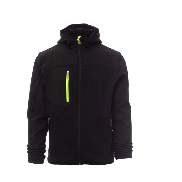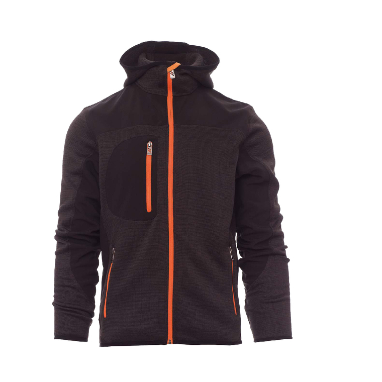 Taillierte Herren-Jacke mit langem versiegeltem SBS-Reißverschluss, vorgeformter Kapuze mit zwei Nähten, feinem Saum an Handgelenk und Taille, zwei Seitentaschen mit Reißverschluss, einer Brusttasche und schwarzen Strick- und Softshell-Einsätzen