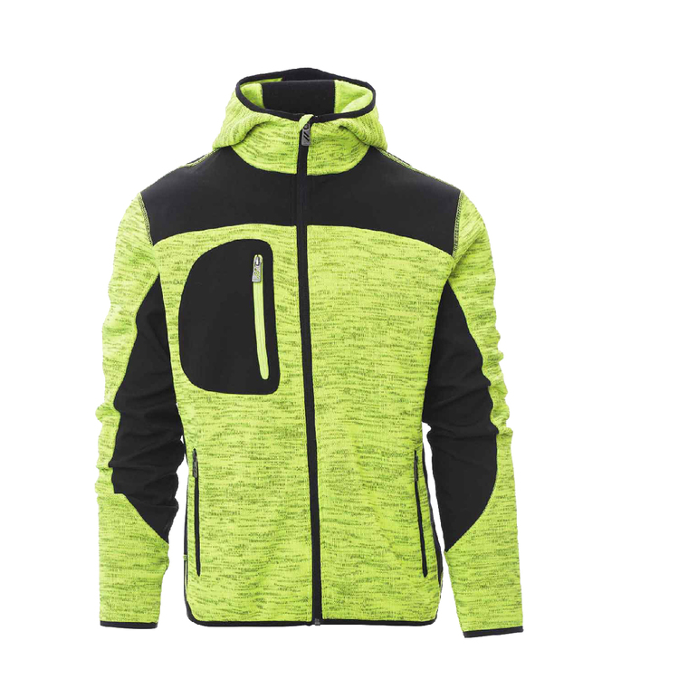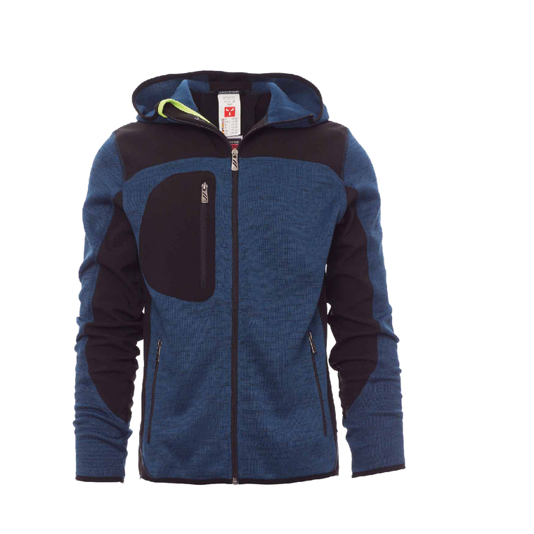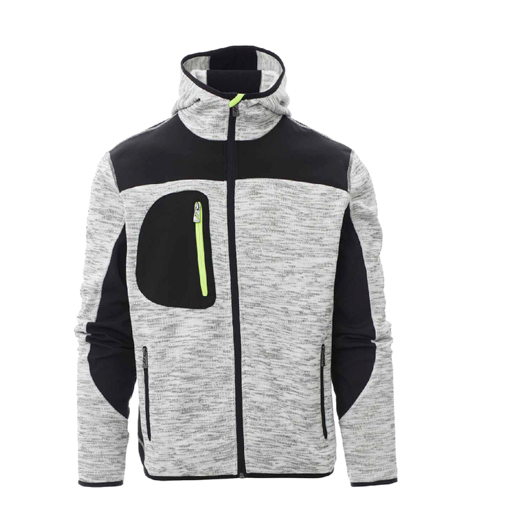 Taillierte Herren-Jacke mit langem versiegeltem SBS-Reißverschluss, vorgeformter Kapuze mit zwei Nähten, feinem Saum an Handgelenk und Taille, zwei Seitentaschen mit Reißverschluss, einer Brusttasche und schwarzen Strick- und Softshell-Einsätzen