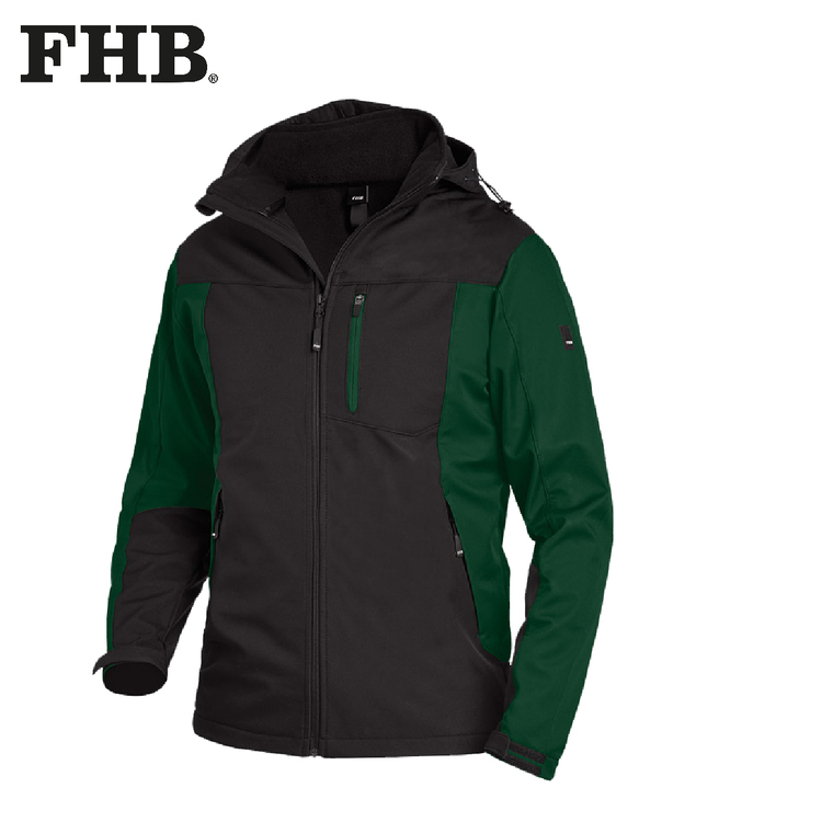 FHB JANNIK Softshelljacke, stark wasserabweisend, winddicht und atmungsaktiv; High-Performance, 10.000mm Wassersäule, 5.000g/qm in 24 Std.; neues FHB-Softshell-Gewebe, dehnbares und extrem geschmeidiges Obermaterial, abnehmbare Kapuze mit Weitenregulierung, FHB Design-Element am Unterarm, körpernahe Passform, 1 offene und 1 mit RV verschließbare Innentasche, Arm-und Bundweitenregulierung