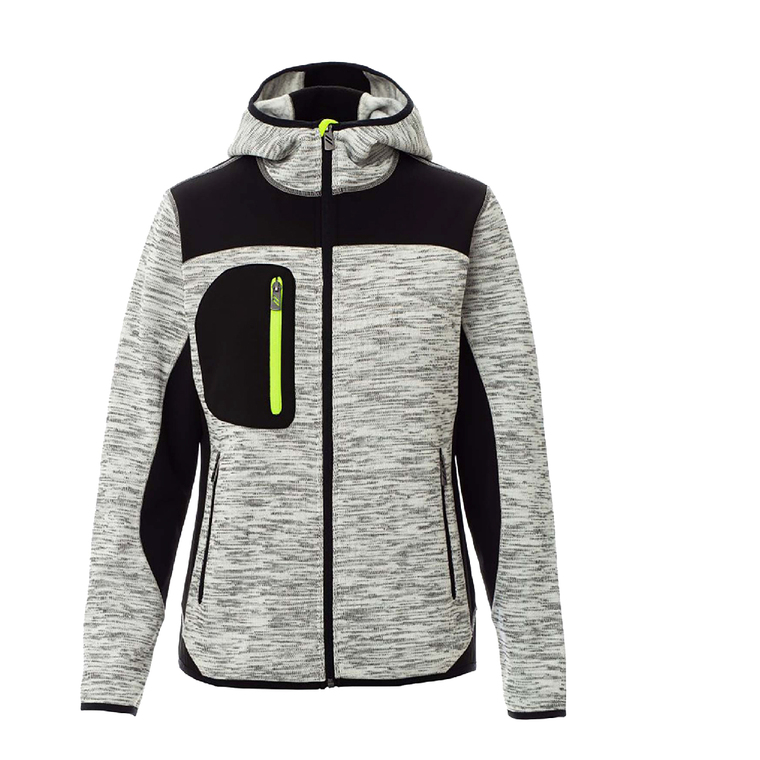 Taillierte Damen-Jacke mit langem versiegeltem SBS-Reißverschluss, vorgeformter Kapuze mit zwei Nähten, feinem Saum an Handgelenk und Taille, zwei Seitentaschen mit Reißverschluss, einer Brusttasche und schwarzen Strick- und Softshell-Einsätzen.