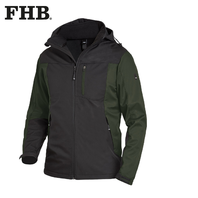 FHB JANNIK Softshelljacke, stark wasserabweisend, winddicht und atmungsaktiv; High-Performance, 10.000mm Wassersäule, 5.000g/qm in 24 Std.; neues FHB-Softshell-Gewebe, dehnbares und extrem geschmeidiges Obermaterial, abnehmbare Kapuze mit Weitenregulierung, FHB Design-Element am Unterarm, körpernahe Passform, 1 offene und 1 mit RV verschließbare Innentasche, Arm-und Bundweitenregulierung