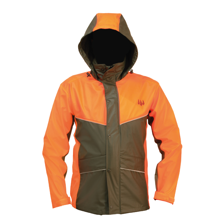 100 % wasserdichte und atmungsatkive Regenjacke in der Farbe signal orange/grün mit ganz dünnen Signalstreifen für Ihre Sicherheit aus 100 % Polyester.